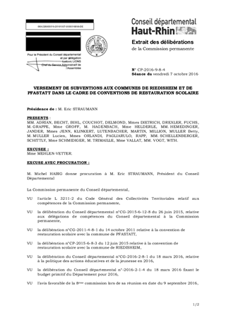 VERSEMENT DE SUBVENTIONS AUX COMMUNES DE RIEDISHEIM ET DE PFASTATT DANS LE CADRE DE CONVENTIONS DE RESTAURATION SCOLAIRE