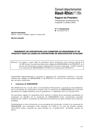 Le rapport a pour objet le versement d’une subvention d’un montant global de 10 000 € pour l’accueil des élèves des collèges de RIEDISHEIM et de PFASTATT au service de restauration scolaire organisé par ces deux communes : 5 000 € alloués à la commune de RIEDISHEIM et 5 000 € à la commune de PFASTATT.