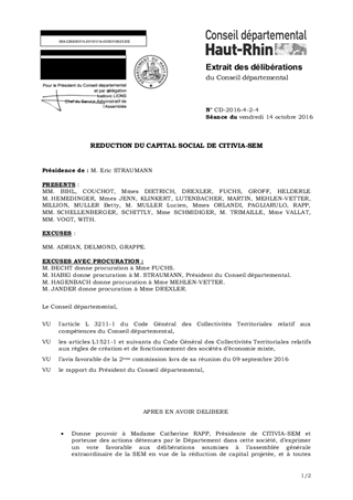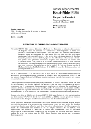 CITIVIA SEM a mené d'intenses efforts en vue d'assainir sa situation économique et d'apurer tous les contrats de concessions d'aménagement la liant avec plusieurs communes du département. Tous ces efforts ont amené la SEM à devoir constater dans ses comptes des provisions liées au fait que des opérations anciennes s'avèreront déficitaires et des pertes liées à la baisse d'activité. De plus, la société, dans un marché difficile, éprouve des difficultés à relancer son activité. Les pertes ainsi générées nécessitent d'opérer une réduction de capital afin d'apurer le bilan. Le 4 juillet 2016, le conseil d'administration de la SEM a décidé de convoquer une assemblée générale extraordinaire (AGE) appelée à se prononcer sur cette réduction du capital social de la société. Il s'agit de donner mandat à Madame Catherine RAPP, Présidente de la SEM, de voter les décisions qui seront prises par cette AGE.
