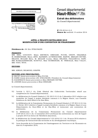 APPEL A PROJETS HOTELLERIE 2015MODIFICATION D'UNE CONVENTION DE FINANCEMENT