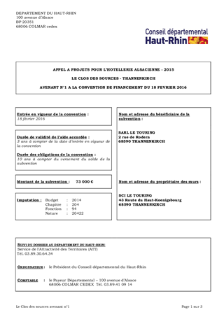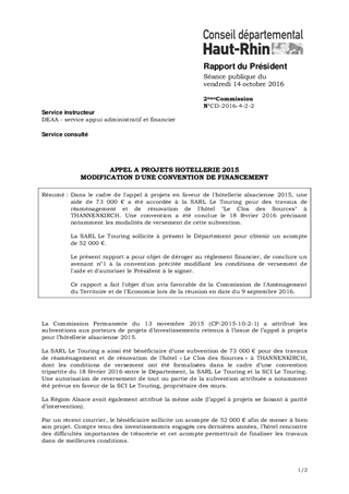 Dans le cadre de l'appel à projets en faveur de l'hôtellerie alsacienne 2015, une aide de 73 000 € a été accordée à la SARL Le Touring pour des travaux de réaménagement et de rénovation de l'hôtel "Le Clos des Sources" à THANNENKIRCH. Une convention a été conclue le 18 février 2016 précisant notamment les modalités de versement de cette subvention. La SARL Le Touring sollicite à présent le Département pour obtenir un acompte de 52 000 €. Le présent rapport a pour objet de déroger au réglement financier, de conclure un avenant n°1 à la convention précitée modifiant les conditions de versement de l'aide et d'autoriser le Président à le signer. Ce rapport a fait l'objet d'un avis favorable de la Commission de l'Aménagement du Territoire et de l'Economie lors de la réunion en date du 9 septembre 2016.