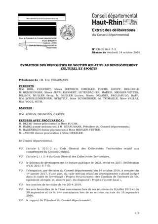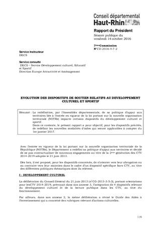 La redéfinition, par l’Assemblée départementale, de sa politique d’appui aux territoires liée à l’entrée en vigueur de la loi portant sur la nouvelle organisation territoriale (NOTRe) impacte certains dispositifs du développement culturel et sportif. Dans ce contexte, le présent rapport a pour objectif, pour les dispositifs précités, de redéfinir les nouvelles modalités d’aides qui seront applicables à compter du 1er janvier 2017.