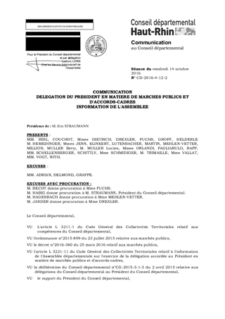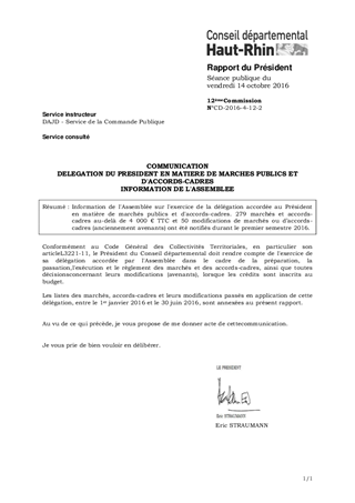 Information de l'Assemblée sur l'exercice de la délégation accordée au Président en matière de marchés publics et d'accords-cadres. 279 marchés et accords-cadres au-delà de 4 000 € TTC et 50 modifications de marchés ou d’accords-cadres (anciennement avenants) ont été notifiés durant le premier semestre 2016.