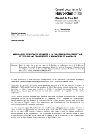 Dans le cadre du projet de création de la réserve biologique mixte de la Haute-Bers et du Seewand, il vous est proposé d'émettre un avis favorable à l’application du régime forestier à la parcelle départementale section A n°16 au lieu-dit Sternsee à RIMBACH-PRES-MASEVAUX.