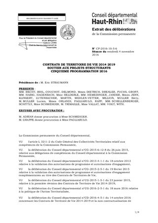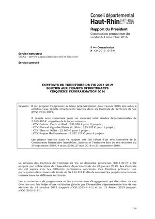 Il est proposé d’approuver la 5ème programmation pour l’année 2016 des aides à attribuer aux projets structurants inscrits dans les Contrats de Territoire de Vie (CTV) 2014-2019. 8 projets sont concernés pour un montant total d’aides départementales de 2 865 490 € réparties de la façon suivante : - CTV Colmar, Fecht et Ried : 239 576 € pour 2 projets ; - CTV Florival Vignoble Plaine du Rhin : 225 937 € pour 1 projet ; - CTV Thur et Doller : 22 800 € pour 1 projet ; - CTV Région Mulhousienne : 2 377 177 € pour 4 projets ; Les projets inscrits dans ce rapport ont fait l’objet d’un avis favorable de la Commission Patrimoine Immobilier, Actions et Territoires lors de ses réunions du 29 septembre 2014, 4 mars 2016, 27 mai 2016 et 23 septembre 2016.