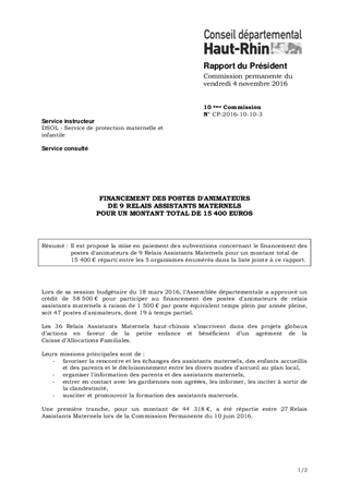 FINANCEMENT DES POSTES D'ANIMATEURS DE 9 RELAIS ASSISTANTS MATERNELSPOUR UN MONTANT TOTAL DE 15 400 EUROS