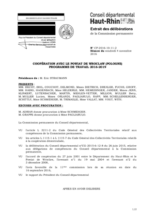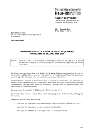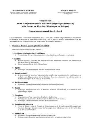 Dans le cadre de la coopération entre le Département du Haut-Rhin et le Powiat de Wroclaw (Pologne), il vous est proposé d'approuver le programme de travail 2016-2019.