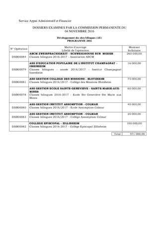 Depuis 1991, le Département du Haut-Rhin soutient la mise en œuvre de l’enseignement bilingue privé et associatif, notamment les classes et sections dont les enseignants ne sont pas sous contrat avec l'Education nationale. Plusieurs structures peuvent fonctionner grâce à ces subventions dont le versement est réparti sur deux exercices budgétaires. Un premier mandatement d'un montant de 50% de l’aide est fait dès la signature des conventions et le solde est versé à réception des justificatifs requis à la fin de l’année scolaire. Pour l’année scolaire 2016/2017, les propositions de soutiens à ces établissements représentent un montant total de 571 000 €, disponible au BP 2016, à répartir pour moitié sur les budgets de 2016 et de 2017. Il s’agit de : Ecoles primaires : Association pour le Bilinguisme en Classe dès la Maternelle (ABCM) : 260 000 € Ecole Sainte-Geneviève à Sainte Marie-aux-Mines : 60 000 € Institut de l’Assomption à Colmar : 40 000 € Collèges : Institut de l’Assomption à Colmar : 20 000 € Collège Champagnat à Issenheim : 16 000 € Collège des Missions à Blotzheim : 75 000 € Collège Episcopal à Zillisheim : 100 000 € Ainsi 50%, soit 285 500 € seraient versés en 2016. Ce rapport a fait l’objet d’un avis favorable de la part de la Commission Actions, Relations Internationales et Promotion du Bilinguisme qui s’est réunie le 16 septembre 2016.