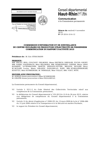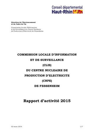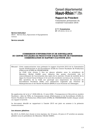 COMMISSION D'INFORMATION ET DE SURVEILLANCEDU CENTRE NUCLÉAIRE DE PRODUCTION D'ÉLECTRICITÉ DE FESSENHEIMCOMMUNICATION DU RAPPORT D'ACTIVITÉ 2015