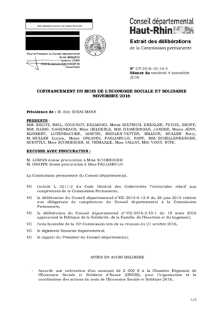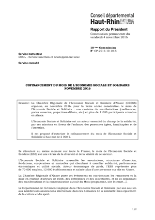 La Chambre Régionale de l'Economie Sociale et Solidaire d’Alsace (CRESS) organise, en novembre 2016, pour la 9ème année consécutive, le mois de l’Economie Sociale et Solidaire : une centaine de manifestations (conférences, portes ouvertes, projections-débats, etc.) et plus de 7 000 participants attendus en Alsace. L’Economie Sociale et Solidaire est un acteur essentiel du champ de la solidarité, par ses missions en faveur de l’enfance, des personnes âgées, handicapées et de l’insertion. Il est proposé d'autoriser le cofinancement du mois de l’Economie Sociale et Solidaire à hauteur de 2 000 €.
