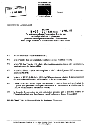 Portant prorogation de l'autorisation de créer une section spécialisée de 11 places pour personnes handicapées vieillissantes à l'établissement Saint Joseph de Thann et habilitation au titre de l'aide sociale Resumé Pièces jointes ARRETE Assemblée : Non défini Date : 12/04/2002 Rapporteur : Non défini Collectivité : Conseil départemental du Haut-Rhin Direction : Non défini Service : Service de la Tarification des Etablissements Domaine : Personnes Agées Commission :