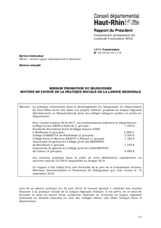 La politique volontariste dans le développement du bilinguisme du Département du Haut-Rhin inclut des aides aux projets "théâtre" proposés en langue régionale (Hochdeutsch ou Elsasserditsch) dans les collèges bilingues publics et privés du département. Pour l’année scolaire 2016-2017, six établissements sollicitent le Département : Collège Lucien HERR d'Altkirch (1 groupe) : 1 250 € Fondation Providence Ecole (Collège) Jeanne d’ARC à Mulhouse (4 groupes) : 5 000 € Collège GAMBETTA de Riedisheim (2 groupes) : 2 500 € Collège Katia et Maurice KRAFFT à Pfastatt (1 groupe) : 1 250 € Association de gestion du Collège privé des MISSIONS de Blotzheim (1 groupe) 1 250 € Association de gestion du Collège privé de l'ASSOMPTION de Colmar (4 groupes) 5 000 € Les soutiens proposés dans le cadre de cette délibération représentent un montant total de 16 250 € disponibles au budget 2016. Ce rapport a fait l’objet d’un avis favorable de la part de la Commission Actions, Relations Internationales et Promotion du Bilinguisme qui s’est réunie le 16 septembre 2016.