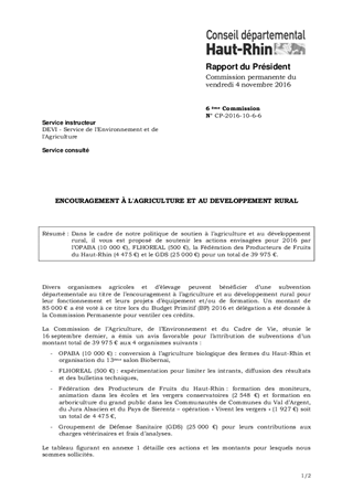 Dans le cadre de notre politique de soutien à l’agriculture et au développement rural, il vous est proposé de soutenir les actions envisagées pour 2016 par l’OPABA (10 000 €), FLHOREAL (500 €), la Fédération des Producteurs de Fruits du Haut-Rhin (4 475 €) et le GDS (25 000 €) pour un total de 39 975 €.