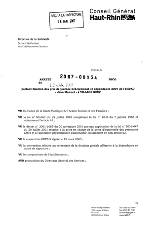 portant fixation des prix de journée hébergement et dépendance 2007 de l'EHPAD "Jean Monnet" à VILLAGE -NEUF. Resumé Pièces jointes ARRETE Assemblée : Non défini Date : 15/01/2007 Rapporteur : Non défini Collectivité : Conseil départemental du Haut-Rhin Direction : Non défini Service : Service de la Tarification des Etablissements Domaine : Prix de Journée Commission :