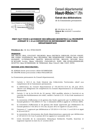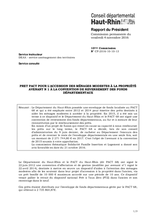 Le Département du Haut-Rhin possède une enveloppe de fonds localisée au PACT 68 et qui a été employée entre 2012 et 2014 pour émettre des prêts destinés à aider les ménages modestes à accéder à la propriété. En 2015, il a été mis un terme à ce dispositif et le Département du Haut-Rhin et le PACT 68 ont signé une convention de reversement des fonds départementaux, au fur et à mesure de leur reconstitution par le remboursement des prêts. En raison d’un projet de fusion qui remet en cause sa capacité à nous rembourser les prêts sur le long terme, le PACT 68 a décidé, lors de son conseil d’administration du 9 juin dernier, de racheter au Département l’encours des prêts et de reverser le reste de l’enveloppe départementale en une seule fois, soit un montant de 2 271 744,80 € en 2017. C'est l'objet de l'avenant à la convention de 2015 soumis à votre approbation. La commission thématique Solidarité Famille Insertion et Logement a donné son avis favorable en date du 21 octobre 2016.