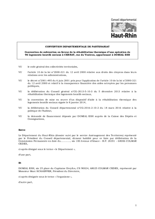 Dans le cadre de la politique départementale de l’habitat et de la démarche « transition énergétique de la Haute-Alsace », le Département soutient la rénovation thermique des logements du parc social. A ce titre, il vous est proposé d’accorder à DOMIAL ESH une subvention départementale de : - 254 400 € pour 96 logements à CERNAY, rue du Ventron ; - 159 000 € pour 60 logements à VIEUX-THANN, rue du Rhin ; - 63 600 € pour 24 logements à VIEUX-THANN, rue de Reiningue ; soit un montant total de 477 000 €. Il est proposé la signature d’une convention par opération fixant notamment le montant de la subvention départementale et ses modalités de versement.