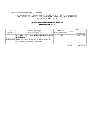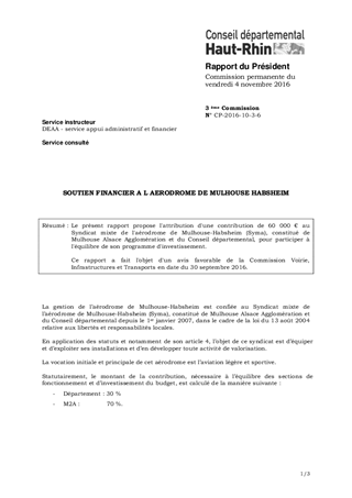 Le présent rapport propose l'attribution d'une contribution de 60 000 € au Syndicat mixte de l'aérodrome de Mulhouse-Habsheim (Syma), constitué de Mulhouse Alsace Agglomération et du Conseil départemental, pour participer à l'équilibre de son programme d'investissement. Ce rapport a fait l'objet d'un avis favorable de la Commission Voirie, Infrastructures et Transports en date du 30 septembre 2016.