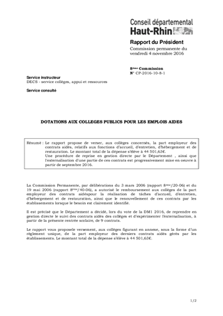 Le rapport propose de verser, aux collèges concernés, la part employeur des contrats aidés, relatifs aux fonctions d’accueil, d’entretien, d’hébergement et de restauration. Le montant total de la dépense s’élève à 44 501,63€. Une procédure de reprise en gestion directe par le Département , ainsi que l'externalisation d'une partie de ces contrats est progressivement mise en oeuvre à partir de septembre 2016.