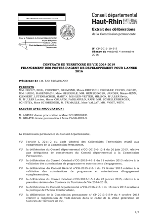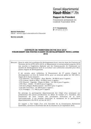 Dans le cadre de la politique de développement local, inscrite dans les Contrats de Territoire de Vie (CTV) 2014-2019, le Département a contractualisé jusqu’en 2016 son soutien à l’ingénierie déployée par les Communautés de Communes en matière de développement local en accordant une subvention annuelle pour deux postes d’agent de développement. Il est soumis, pour validation, le financement de 37 postes d’agent de développement au titre de l’année 2016, pour un montant global de 460 280 €, réparti de la façon suivante : - CTV Piémont – Val d’Argent – Pays Welche : 56 800 € pour 5 agents ; - CTV Colmar, Fecht et Ried : 52 800 € pour 4 agents ; - CTV Florival - Vignoble - Plaine du Rhin : 93 200 € pour 8 agents ; - CTV Thur – Doller : 75 200 € pour 6 agents ; - CTV de la Région Mulhousienne : 26 400 € pour 2 agents ; - CTV des Trois Pays : 44 400 € pour 3 agents ; - CTV Sundgau : 111 480 € pour 9 agents. En principe, la participation départementale fait l’objet d’un versement sur présentation des pièces justificatives au début de l’année n+1. Toutefois, afin notamment de tenir compte des prochaines évolutions de la carte intercommunale, il est proposé d’anticiper le versement de la participation départementale à fin 2016, au lieu de 2017. Ce rapport a fait l’objet d’un avis favorable de la Commission Patrimoine Immobilier, Actions et Territoires lors de sa réunion du 23 septembre 2016.