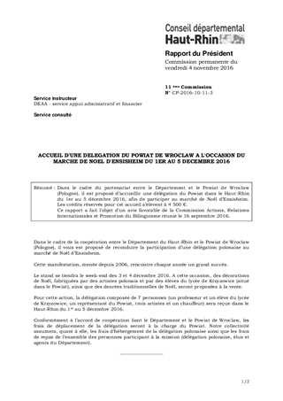 Dans le cadre du partenariat entre le Département et le Powiat de Wroclaw (Pologne), il est proposé d’accueillir une délégation du Powiat dans le Haut-Rhin du 1er au 5 décembre 2016, afin de participer au marché de Noël d’Ensisheim. Les crédits réservés pour cet accueil s’élèvent à 4 500 €. Ce rapport a fait l'objet d'un avis favorable de la Commission Actions, Relations Internationales et Promotion du Bilinguisme réunie le 16 septembre 2016.