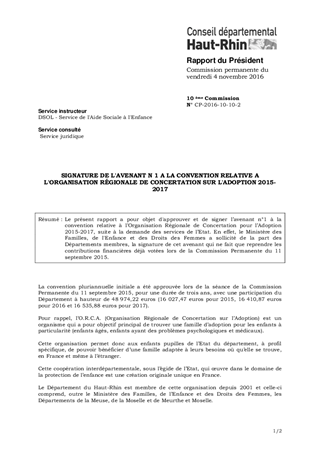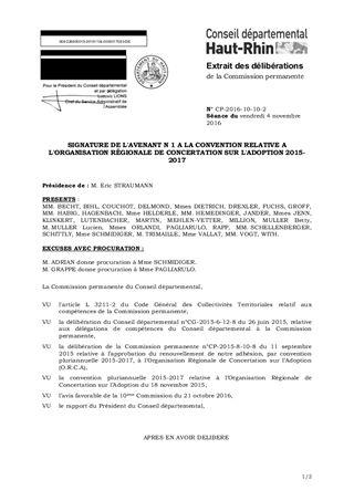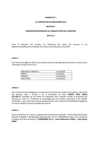 SIGNATURE DE L'AVENANT N 1 A LA CONVENTION RELATIVE A L'ORGANISATION RÉGIONALE DE CONCERTATION SUR L'ADOPTION 2015-2017