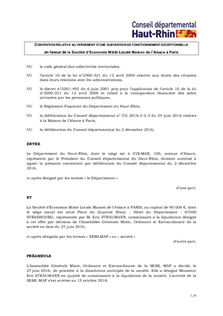 Dans le cadre de la liquidation de la Société d’Economie Mixte Locale Maison de l’Alsace à Paris, qui a poursuivi son activité jusqu'au 15 octobre 2016, il y a lieu de lui allouer une aide exceptionnelle de 70 000 €, à parité avec le Département du Bas-Rhin. Il est proposé d'approuver la convention relative au versement de cette subvention exceptionnelle et d'autoriser le Président à la signer.