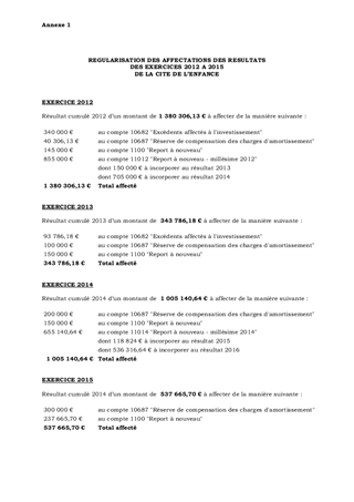 REGULARISATION DES AFFECTATIONS DES RESULTATS DES EXERCICES 2012 A 2015 DE LA CITE DE L'ENFANCE