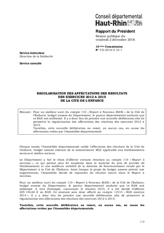 Pour un meilleur suivi du compte 110 « Report à Nouveau (RAN) » de la Cité de l’Enfance, budget annexe du Département, le payeur départemental souhaite que ce RAN soit millésimé. Il y a donc lieu de prendre une nouvelle délibération afin de permettre la régularisation des affectations des résultats des exercices 2012 à 2015. Toutefois, cette nouvelle délibération ne remet, en aucun cas, en cause les affectations votées par l’Assemblée départementale.