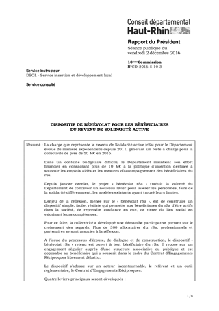 La charge que représente le revenu de Solidarité active (rSa) pour le Département évolue de manière exponentielle depuis 2011, générant un reste à charge pour la collectivité de près de 50 M€ en 2016. Dans un contexte budgétaire difficile, le Département maintient son effort financier en consacrant plus de 10 M€ à la politique d’insertion destinée à soutenir les emplois aidés et les mesures d’accompagnement des bénéficiaires du rSa. Depuis janvier dernier, le projet « bénévolat rSa » traduit la volonté du Département de concevoir un nouveau levier pour insérer les personnes, faire de la solidarité différemment, les modèles existants ayant trouvé leurs limites. L’enjeu de la réflexion, menée sur le « bénévolat rSa », est de construire un dispositif simple, facile, réaliste qui permette aux bénéficiaires du rSa d’être actifs dans la société, de reprendre confiance en eux, de tisser du lien social en valorisant leurs compétences. Pour ce faire, la collectivité a développé une démarche participative portant sur le croisement des regards. Plus de 300 allocataires du rSa, professionnels et partenaires se sont associés à la réflexion. A l’issue du processus d’écoute, de dialogue et de construction, le dispositif « bénévolat rSa » retenu est ouvert à tout bénéficiaire du rSa. Il repose sur un engagement régulier auprès d’une structure associative ou publique et est opposable au bénéficiaire qui y souscrit dans le cadre du Contrat d’Engagements Réciproques librement débattu. Le dispositif s’adosse sur un acteur incontournable, le référent et un outil règlementaire, le Contrat d’Engagements Réciproques. Quatre leviers principaux seront développés : - une plateforme internet accessible aux différents acteurs (hébergement des offres, documents utiles, coordonnées des associations de proximité) ; - une mobilisation des structures porteuses d’offres ; - la formation des professionnels de l’insertion ; - des groupes d’entraide d’allocataires permettant un soutien pratique et une aide aux démarches des bénéficiaires. L’ensemble du dispositif sera lancé de manière progressive avec pour objectif une effectivité des différents axes en mars 2017. Aussi, il vous est proposé d’adopter le dispositif tel que décrit dans le présent rapport.