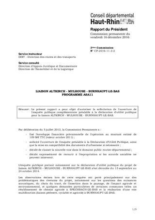 Le présent rapport a pour objet d'autoriser la sollicitation de l'ouverture de l'enquête publique complémentaire préalable à la déclaration d'utilité publique pour la liaison ALTKIRCH - MULHOUSE - BURNHAUPT-LE-BAS.