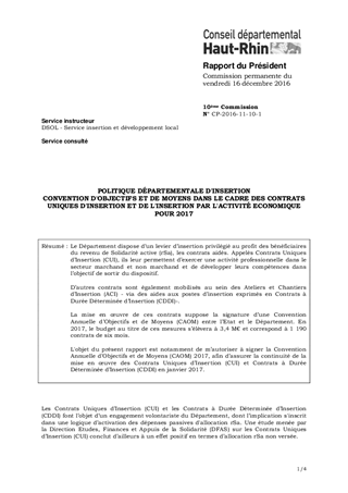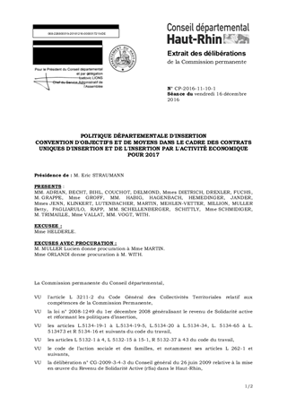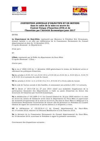 POLITIQUE DÉPARTEMENTALE D'INSERTIONCONVENTION D'OBJECTIFS ET DE MOYENS DANS LE CADRE DES CONTRATS UNIQUES D'INSERTION ET DE L'INSERTION PAR L'ACTIVITÉ ECONOMIQUE POUR 2017
