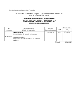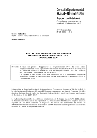 Il vous est proposé d'approuver la programmation 2016 de deux aides, respectivement de 3 713 € pour la Commune de SOULTZEREN et de 2 559 € pour la Commune de PFAFFENHEIM au titre des Projets d'Intérêt Local (PIL) relevant des Contrats de Territoires de Vie 2014-2019. Ce rapport a fait l'objet d'un avis favorable de la Commission Patrimoine Immobilier, Actions et Territoires lors de ses réunions du 23 septembre 2016 et 18 novembre 2016.