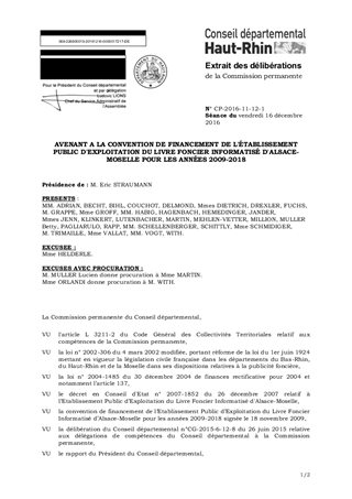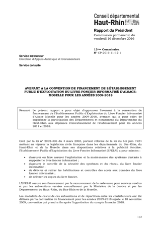 Le présent rapport a pour objet d'approuver l'avenant à la convention de financement de l'Etablissement Public d'Exploitation du Livre Foncier Informatisé d'Alsace Moselle pour les années 2009-2018, avenant qui a pour objet de supprimer la participation des Départements et notamment du Département du Haut-Rhin aux dépenses d'investissement de l'établissement pour les années 2017 et 2018.