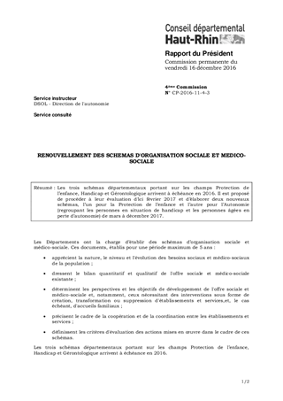 Les trois schémas départementaux portant sur les champs Protection de l’enfance, Handicap et Gérontologique arrivent à échéance en 2016. Il est proposé de procéder à leur évaluation d’ici février 2017 et d’élaborer deux nouveaux schémas, l’un pour la Protection de l’enfance et l’autre pour l’Autonomie (regroupant les personnes en situation de handicap et les personnes âgées en perte d’autonomie) de mars à décembre 2017.