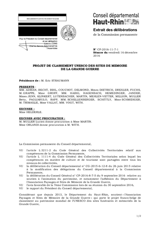 Le présent rapport présente les grands axes du plan de gestion du dossier de candidature des sites funéraires et mémoriels de la Grande Guerre au Patrimoine Mondial de l’Humanité (UNESCO). Ce plan de gestion a été présenté à l’ensemble des acteurs impliqués dans la démarche le 21 novembre dernier. Il décrit un prévisionnel des actions pour la période 2017/2021 ainsi que les actions prioritaires pour l’année 2017-2018 parmi lesquelles figure la mise en place d’un comité départemental de pilotage . L’adoption des grands principes du plan constitue une dernière étape obligatoire avant le dépôt du dossier dont la date est fixée au 20 décembre 2016. Cette démarche a fait l’objet d’un avis favorable de la 7ème Commission réunie le 30 septembre 2016.