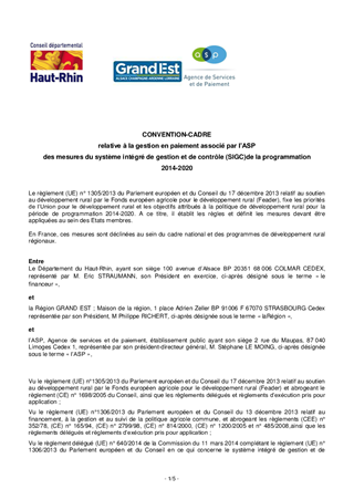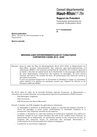Dans le cadre du Plan de Développement Rural 2014-2020, le Département du Haut-Rhin soutient financièrement des mesures agroenvironnementales et climatiques (MAEC). Ces mesures permettent de maintenir des surfaces agricoles en herbe à des fins de préservation de la biodiversité et des paysages identitaires de notre département, d’ouverture des espaces en montagne, de lutte contre l’érosion des sols et les coulées de boue, de préservation des ceintures vertes et des milieux naturels. Il vous est proposé d’approuver et d’autoriser le Président à signer la convention cadre relative à la gestion en paiement associé par l’Agence de Service et de Paiement (ASP) des MAEC.