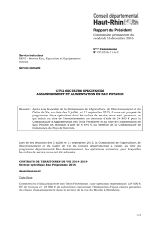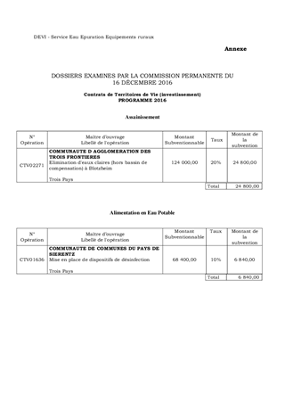 Après avis favorable de la Commission de l'Agriculture, de l'Environnement et du Cadre de Vie, en date des 3 juillet et 11 septembre 2015, il vous est proposé de programmer deux opérations dont les ordres de service nous sont parvenus, ce qui induit au titre de l'Assainissement un montant d'aide de 24 800 € pour la Communauté d'Agglomération des Trois Frontières et au titre de l'Alimentation en Eau Potable un montant d'aide de 6 840 € au bénéfice de la Communauté de Communes du Pays de Sierentz.