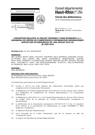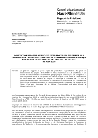 Le présent rapport a pour objet de permettre l'approbation du plan de financement du projet INTERREG V Rhin Supérieur n°11.1 GeoRhena « Un centre de compétences d’information géographique appuyé par un Géoportail », pour la période entre le 1er juillet 2015 et le 30 juin 2018, dont le Département du Haut-Rhin est porteur et auquel il participe à hauteur de 15 000 € (participation validée à l’occasion de la Commission permanente du 13 novembre 2015), ainsi que la signature de la convention relative à ce projet. Ce rapport a fait l’objet d’un avis favorable de la 11ème Commission qui s’est réunie le 16 septembre 2016.