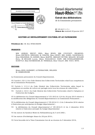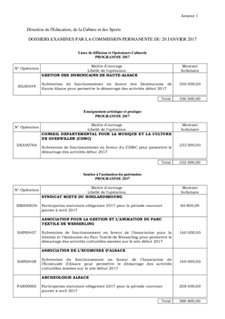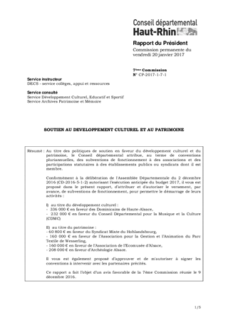 Au titre des politiques de soutien en faveur du développement culturel et du patrimoine, le Conseil départemental attribue, au terme de conventions pluriannuelles, des subventions de fonctionnement à des associations et des participations statutaires à des établissements publics ou syndicats dont il est membre. Conformément à la délibération de l'Assemblée Départementale du 2 décembre 2016 (CD-2016-5-1-2) autorisant l’exécution anticipée du budget 2017, il vous est proposé dans le présent rapport, d’attribuer et d'autoriser le versement, par avance, de subventions de fonctionnement, pour permettre le démarrage de leurs activités : I) au titre du développement culturel : - 336 000 € en faveur des Dominicains de Haute-Alsace, - 232 000 € en faveur du Conseil Départemental pour la Musique et la Culture (CDMC) II) au titre du patrimoine : - 60 800 € en faveur du Syndicat Mixte du Hohlandsbourg, - 160 000 € en faveur de l’Association pour la Gestion et l’Animation du Parc Textile de Wesserling, - 160 000 € en faveur de l’Association de l’Ecomusée d’Alsace, - 208 000 € en faveur d’Archéologie Alsace. Il vous est également proposé d’approuver et de m'autoriser à signer les conventions à intervenir avec les partenaires précités. Ce rapport a fait l’objet d’un avis favorable de la 7ème Commission réunie le 9 décembre 2016.