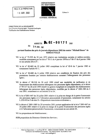 Portant fixation des prix de journée dépendance 2002 du centre Michael Bauer de RIBEAUVILLE Resumé Pièces jointes ARRETE Assemblée : Non défini Date : 15/04/2002 Rapporteur : Non défini Collectivité : Conseil départemental du Haut-Rhin Direction : Non défini Service : Service de la Tarification des Etablissements Domaine : Personnes Agées Commission :
