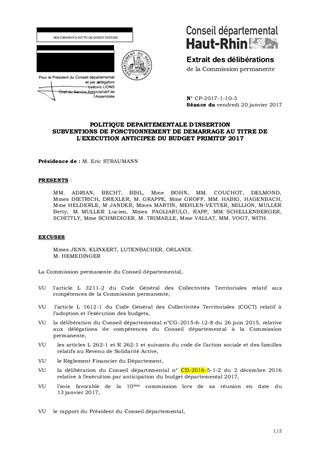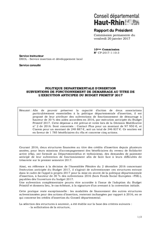 POLITIQUE DEPARTEMENTALE D'INSERTION SUBVENTIONS DE FONCTIONNEMENT DE DEMARRAGE AU TITRE DE L'EXECUTION ANTICIPEE DU BUDGET PRIMITIF 2017