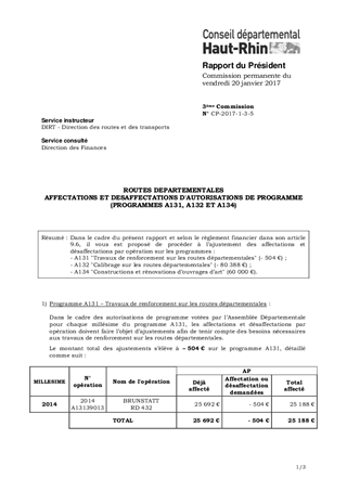 Dans le cadre du présent rapport et selon le règlement financier dans son article 9.6, il vous est proposé de procéder à l’ajustement des affectations et désaffectations par opération sur les programmes : - A131 "Travaux de renforcement sur les routes départementales" (- 504 €) ; - A132 "Calibrage sur les routes départementales" (- 80 388 €) ; - A134 "Constructions et rénovations d’ouvrages d’art" (60 000 €).