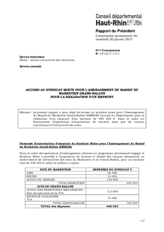 Le présent rapport a pour objet de donner au syndicat mixte pour l’Aménagement du Massif du Markstein Grand-Ballon (SMMGB) l’accord du Département pour la réalisation d’un emprunt d’un montant de 400 000 €, dans le cadre du financement d’opérations d’acquisitions de terrains ainsi que de travaux contribuant à l’attractivité des sites.