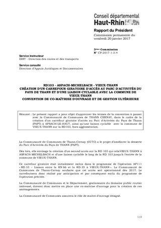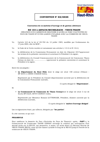 RD103 - ASPACH-MICHELBACH - VIEUX-THANNCRÉATION D'UN CARREFOUR GIRATOIRE D'ACCÈS AU PARC D'ACTIVITÉS DU PAYS DE THANN ET D'UNE LIAISON CYCLABLE AVEC LA COMMUNE DE VIEUX-THANNCONVENTION DE CO-MAÎTRISE D'OUVRAGE ET DE GESTION ULTÉRIEURE