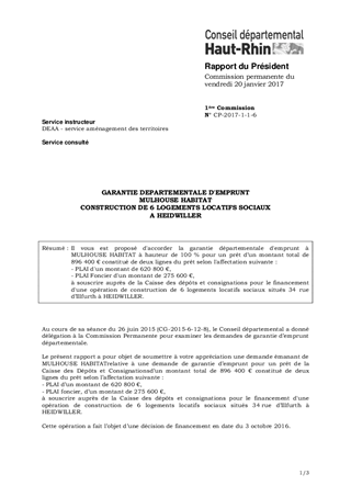 GARANTIE DEPARTEMENTALE D'EMPRUNTMULHOUSE HABITATCONSTRUCTION DE 6 LOGEMENTS LOCATIFS SOCIAUXA HEIDWILLER