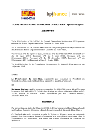 Le présent rapport a pour objet de valider et d'autoriser la signature de l'avenant n°9 à la convention du 28 janvier 2000 relative au Fonds Départemental de Garantie du Haut-Rhin signée entre le Département du Haut-Rhin et SOFARIS Régions (devenu Bpifrance Régions) portant sur la gestion extinctive du fonds départemental de garantie. A ce titre, une somme de 39 365 euros sera reversée au Département du Haut-Rhin. Ce rapport a fait l'objet d'un avis favorable de la Commission Aménagement du Territoire et Economie en date du 21 octobre 2016.