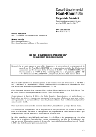 Le présent rapport a pour objet d'approuver la convention de reboisement de la parcelle de M. Jean-Marie HAENNIG en compensation partielle du déboisement occasionné par les travaux de la déviation de la RD 419 à BALLERSDORF. Ces travaux estimés à 10 000 € TTC seront imputés sur le programme AQ111 « RD 419 – Déviation de BALLERSDORF », chapitre 23, fonction 621, nature 2312.