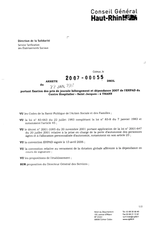 portant fixation des prix de journée hébergement et dépendance 2007 de l'EHPAD du centre hospitalier "Saint Jacques" à THANN. Resumé Pièces jointes ARRETE Assemblée : Non défini Date : 22/01/2007 Rapporteur : Non défini Collectivité : Conseil départemental du Haut-Rhin Direction : Non défini Service : Service de la Tarification des Etablissements Domaine : Prix de Journée Commission :