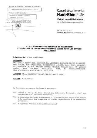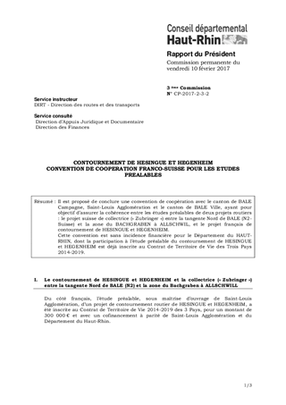 CONTOURNEMENT DE HESINGUE ET HEGENHEIM CONVENTION DE COOPERATION FRANCO-SUISSE POUR LES ETUDES PREALABLES Resumé Pièces jointes DELIBERATION RAPPORT ANNEXE Assemblée : Commission Permanente Date : 10/02/2017 Rapporteur : Non défini Collectivité : Conseil départemental du Haut-Rhin Direction : Non défini Service : Direction des Routes Domaine : Transports / Routes Commission : Commission Permanente