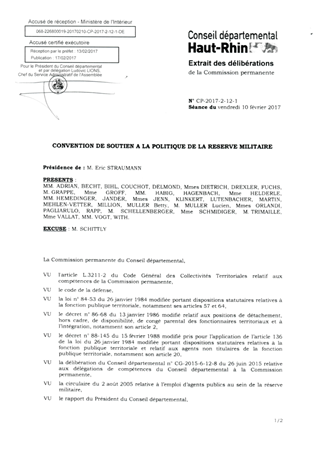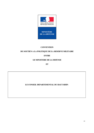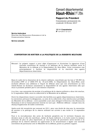 CONVENTION DE SOUTIEN A LA POLITIQUE DE LA RESERVE MILITAIRE Resumé Pièces jointes DELIBERATION RAPPORT ANNEXE Assemblée : Commission Permanente Date : 10/02/2017 Rapporteur : Non défini Collectivité : Conseil départemental du Haut-Rhin Direction : Non défini Service : Direction des Ressources Humaines et Dialogue Social Domaine : Administration Commission : Commission Permanente